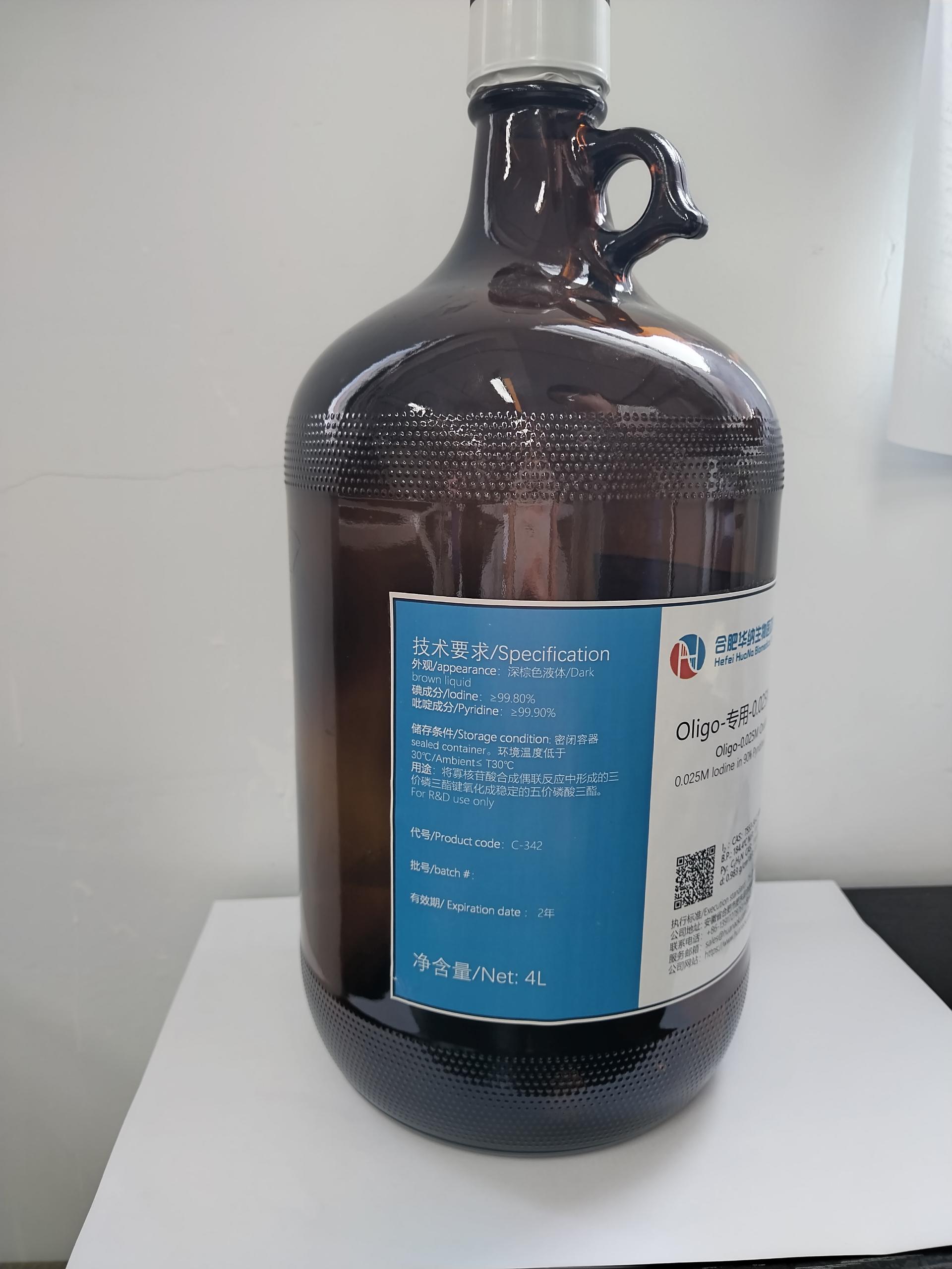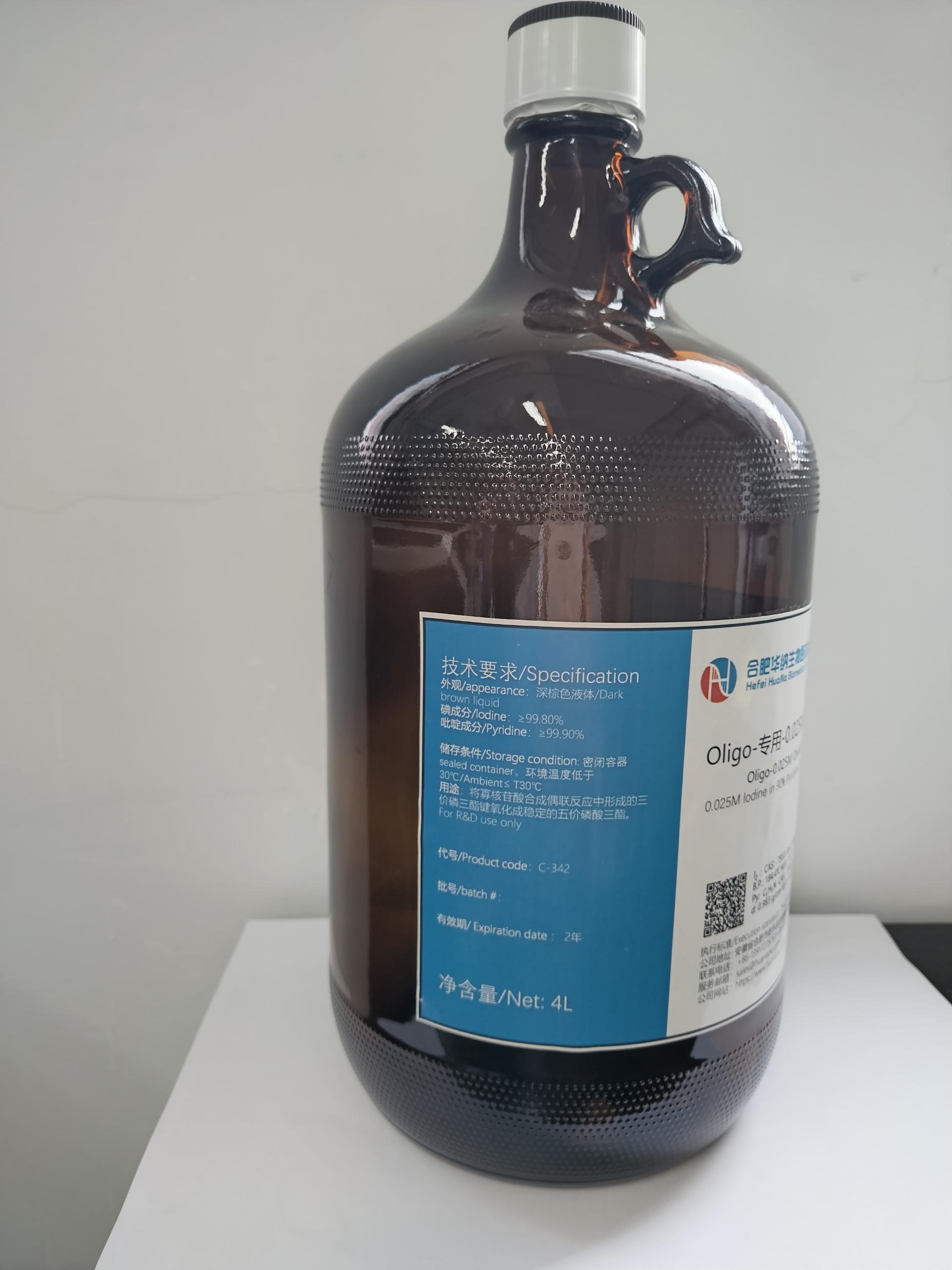 用途:將寡核苷酸合成偶聯(lián)反應(yīng)中形成的三價(jià)磷三酯鍵氧化成穩(wěn)定的五價(jià)磷酸三酯。