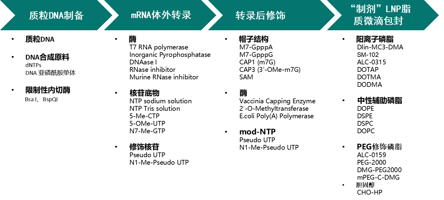mRNA疫苗的研發(fā)及生產(chǎn)涉及多個(gè)環(huán)節(jié),一般包括:病原確認(rèn)、抗原序列設(shè)計(jì)、質(zhì)粒構(gòu)建與擴(kuò)增、mRNA體外合成、純化、遞送系統(tǒng)裝載等一系列環(huán)節(jié)。作為一家以生物化學(xué)和醫(yī)藥中間體研發(fā)、生產(chǎn)和銷售為一體的科技創(chuàng)新產(chǎn)業(yè)平臺(tái),華納生物擁有豐富的產(chǎn)品線,可以向生物技術(shù)研究和產(chǎn)業(yè)提供專業(yè)支持。應(yīng)對(duì)當(dāng)前備受矚目的mRNA核酸疫苗研究與開發(fā),合肥華納生物已推出修飾核苷/亞磷酰胺/IVD原料/mRNA疫苗原料/LNP脂質(zhì)體/熒光染料等系列產(chǎn)品,并持續(xù)推進(jìn)現(xiàn)有產(chǎn)品的升級(jí)與新品的開發(fā)工作,以助力疫苗產(chǎn)業(yè)快速化發(fā)展。